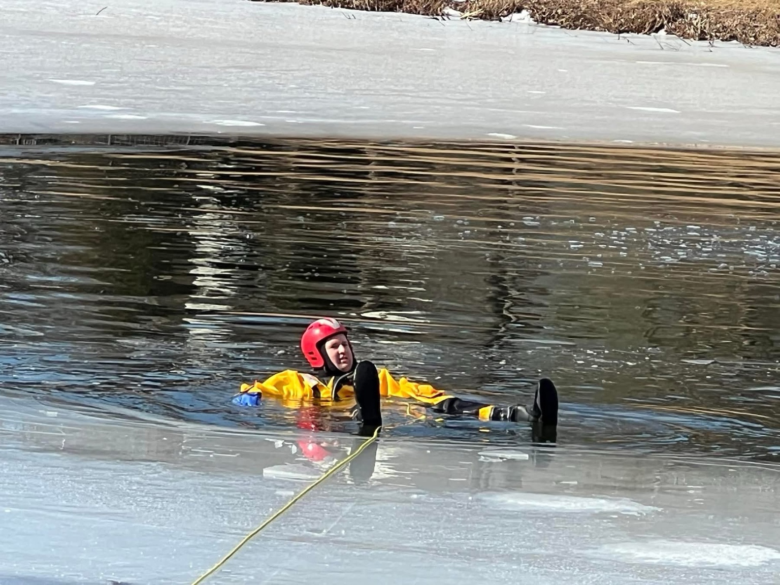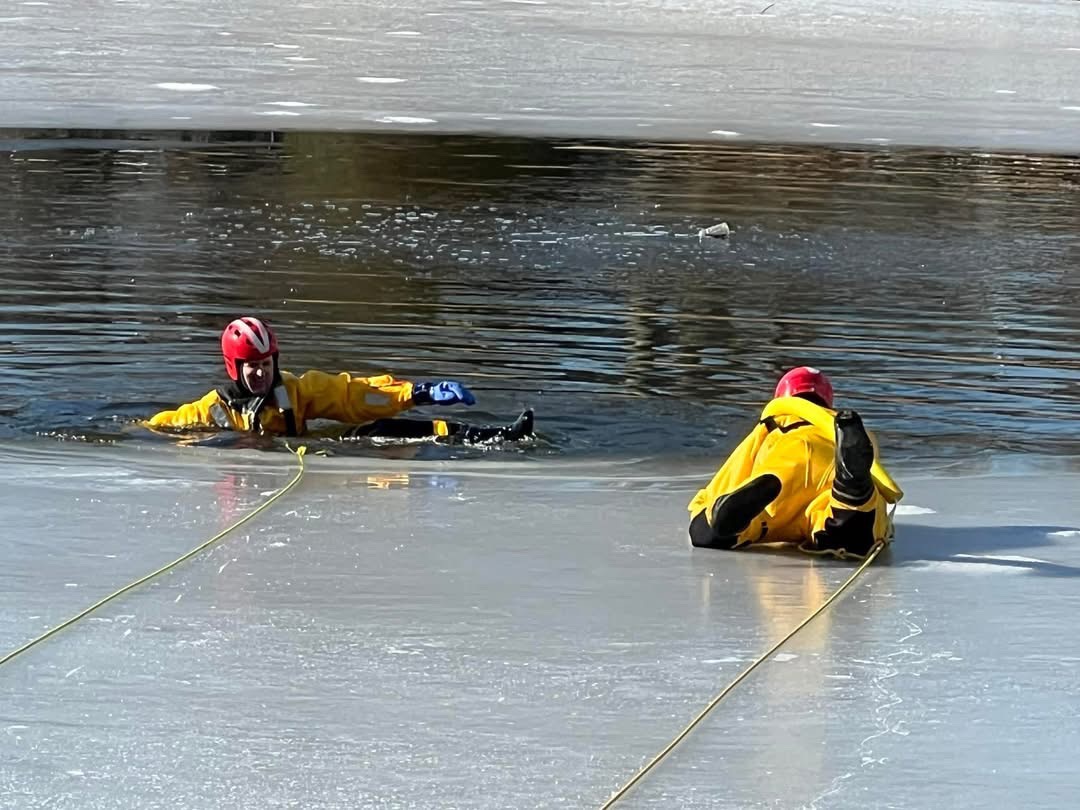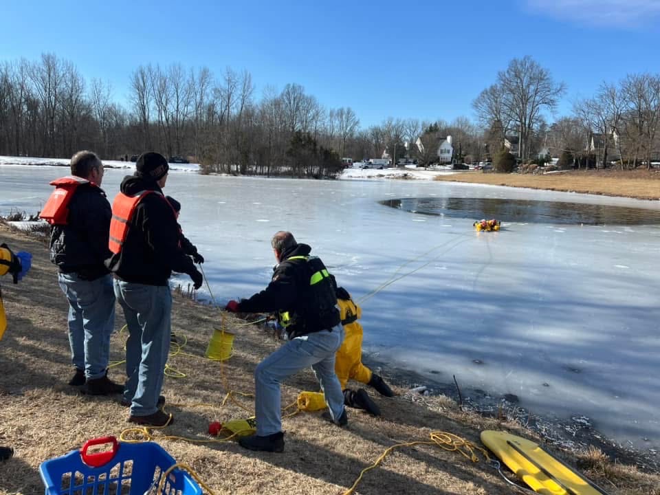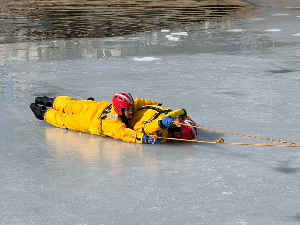 Ice rescue drill covering multiple tactics for cold‑water emergencies. Thanks to Congers‑Valley Cottage VAC for EMS support and Clarkstown PD for drone overwatch and coordination during evolutions.